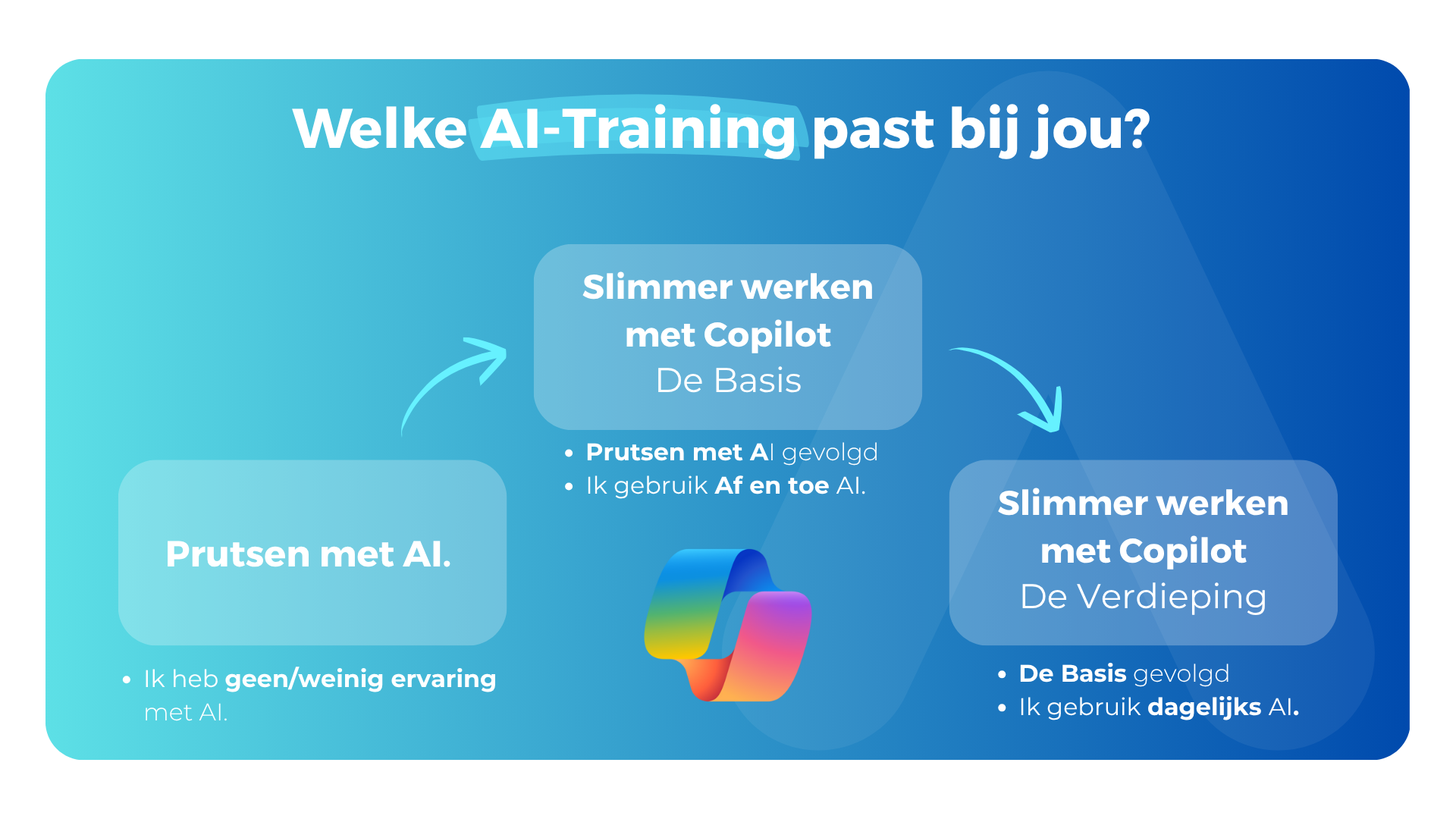 - Gebruik je ChatGPT of Copilot al af en toe, bijvoorbeeld om teksten te schrijven? Dan sluit de Basistraining het beste aan bij jouw niveau.